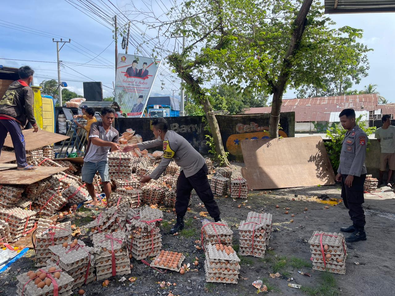 Langkah cepat diambil oleh petugas piket jaga yang langsung turun ke lokasi untuk mengamankan Tempat Kejadian Perkara (TKP) dan mengevakuasi truk yang terbalik. Petugas bersama masyarakat setempat juga segera membantu memindahkan muatan telur agar tidak mengganggu kelancaran lalu lintas lebih jauh. Kegiatan evakuasi dan pembersihan pun dilakukan secara terkoordinasi untuk mengembalikan kondisi jalan raya ke keadaan normal.