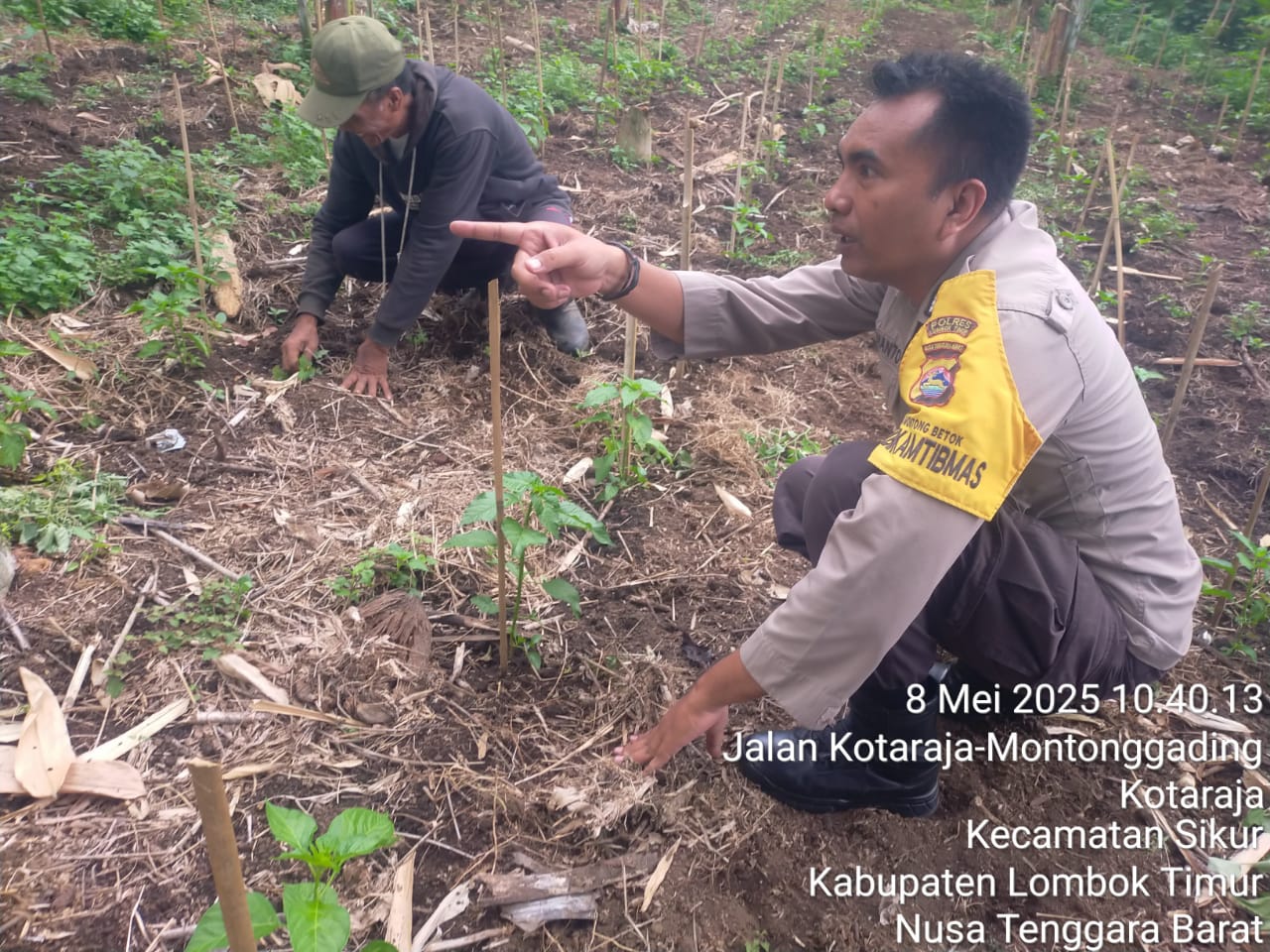 Lombok Timur – Dalam upaya mendukung Program Ketahanan Pangan Bergizi (P2B), Bhabinkamtibmas Desa Montong Betok, Kecamatan Montong Gading, Kabupaten Lombok Timur, Bripka Khurdianto, melaksanakan kegiatan pengecekan dan pemeliharaan tanaman cabai di lahan milik warga binaan. Kegiatan ini berlangsung pada hari Kamis, 8 Mei 2025, Pukul 11.22 Wita.