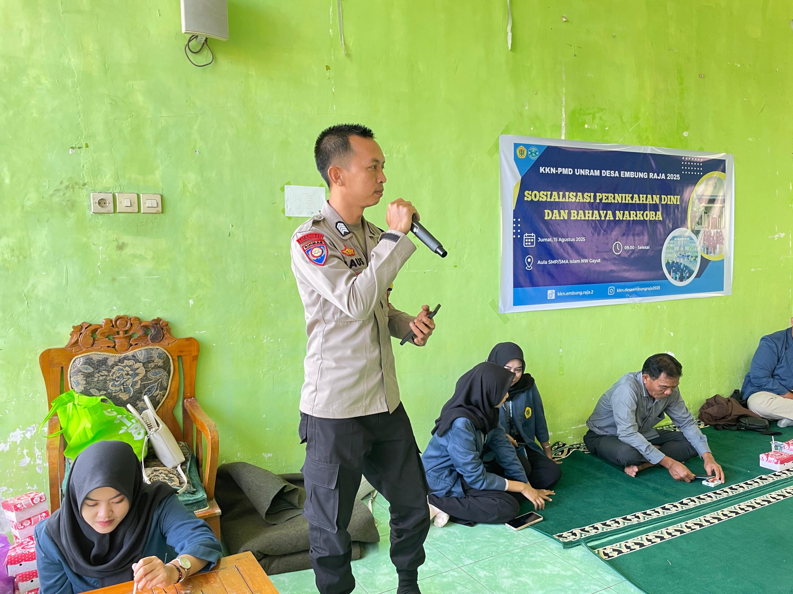 Lombok Timur – Bhabinkamtibmas Desa Embung Raja, Polsek Terara, Bripka Gaus Abdurrozzaq, melaksanakan kegiatan sosialisasi dan penyuluhan tentang pernikahan dini serta bahaya penyalahgunaan narkoba di SMP Islam Baitul Hukmah NW Gayut, Desa Embung Raja, pada Jumat (15/8/2025) pukul 09.00 WITA. Kegiatan ini melibatkan Kepala Desa Embung Raja dan mahasiswa Kuliah Kerja Nyata (KKN) dari Universitas Mataram sebagai bentuk sinergi dalam edukasi masyarakat.