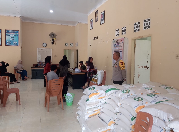 Bripka Ahmad Zarkasi selaku Bhabinkamtibmas melakukan monitoring sejak awal kegiatan untuk memastikan penyaluran berlangsung aman dan tepat sasaran. Kehadirannya juga sebagai bentuk dukungan terhadap upaya pemerintah dalam menyalurkan bantuan pangan kepada masyarakat yang membutuhkan di wilayah binaannya.