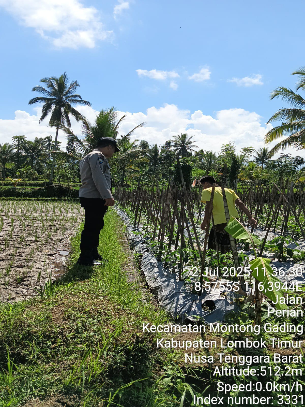 Lombok Timur — Dalam rangka mendukung program nasional Ketahanan Pangan Bergizi (P2B), Bhabinkamtibmas Desa Perian Polsek Montong Gading, Aipda M. Suryadi S. JPH, melaksanakan kegiatan pengecekan dan pemeliharaan lahan pertanian bersama kelompok tani “Maju Bersama” yang diketuai oleh Satria Pratama, S.Pd. Kegiatan tersebut berlangsung pada hari Rabu, 2 Juli 2025, sekitar pukul 11.30 Wita, bertempat di Gubuk Terawangan, Dusun Keluncing, Desa Perian, Kecamatan Montong Gading, Kabupaten Lombok Timur.