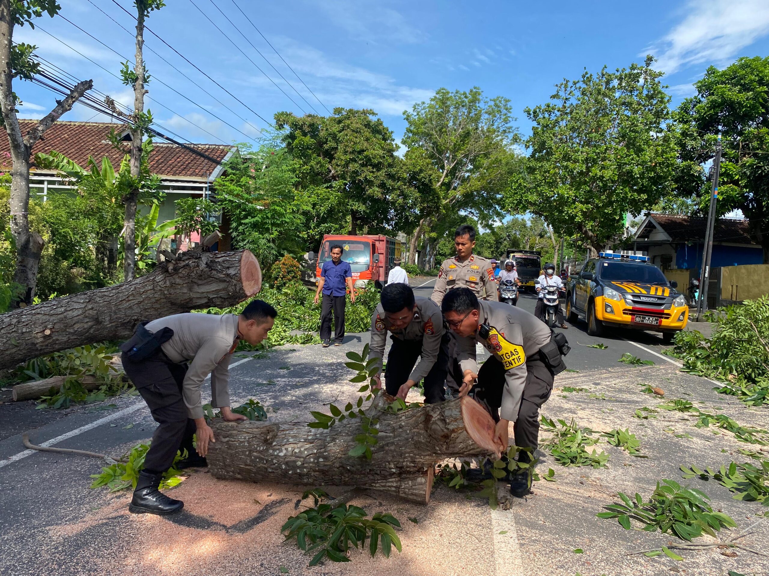 Pada saat pelaksanaan patroli, anggota Sat Samapta Polres Lombok Timur menemukan pohon tumbang yang menghalangi jalan raya di Jalan Raya TGH. Umar, Kelurahan Kelayu, Kecamatan Selong. Pohon tersebut jatuh akibat angin kencang dan hujan terus menerus. Kondisi ini mengganggu arus lalu lintas yang melalui wilayah tersebut, yang membutuhkan penanganan cepat untuk mengurangi dampak lebih lanjut.