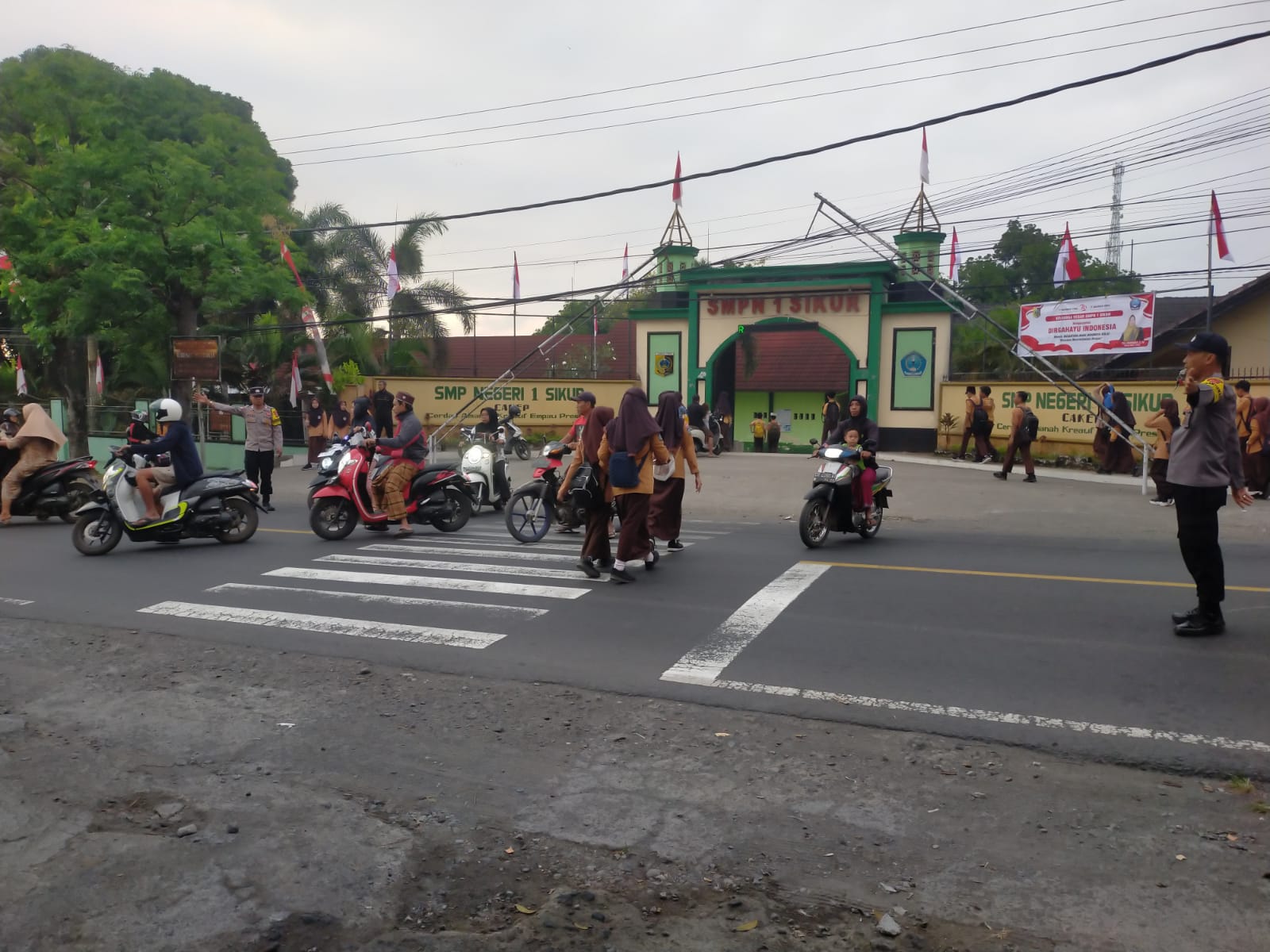 Personel Polsek Sikur secara aktif terlibat dalam pengaturan lalu lintas di kawasan sekolah-sekolah. Mereka tidak hanya mengatur arus kendaraan, tetapi juga membantu anak-anak sekolah yang sedang menyeberang jalan. Kehadiran petugas ini memberikan rasa aman bagi para pelajar dan orang tua yang mengantar, sehingga proses kegiatan belajar mengajar di sekolah dapat berlangsung dengan lancar dan aman.