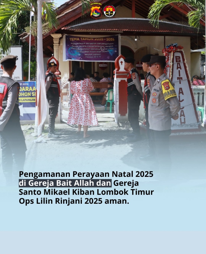 Lombok Timur – Pengamanan Perayaan Natal 2025 di Gereja Bait Allah dan Gereja Santo Mikael Kiban, Kabupaten Lombok Timur, berlangsung aman, tertib, dan kondusif.Ksmis(25/12/25)., pukul 06.30 Wita.